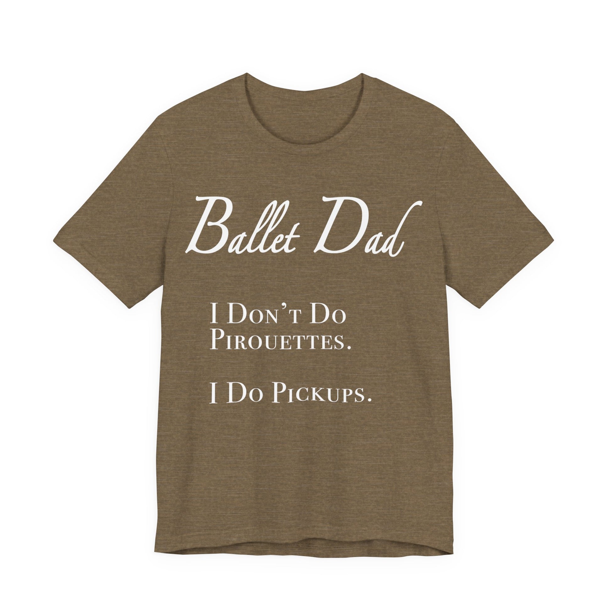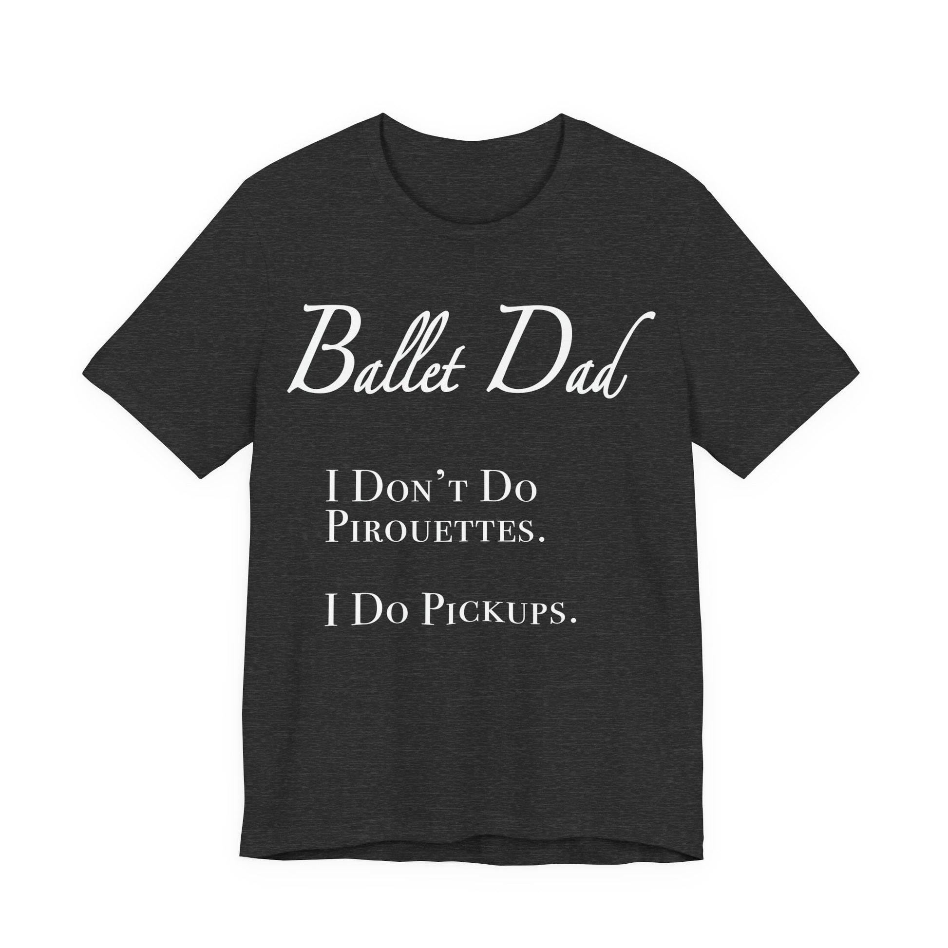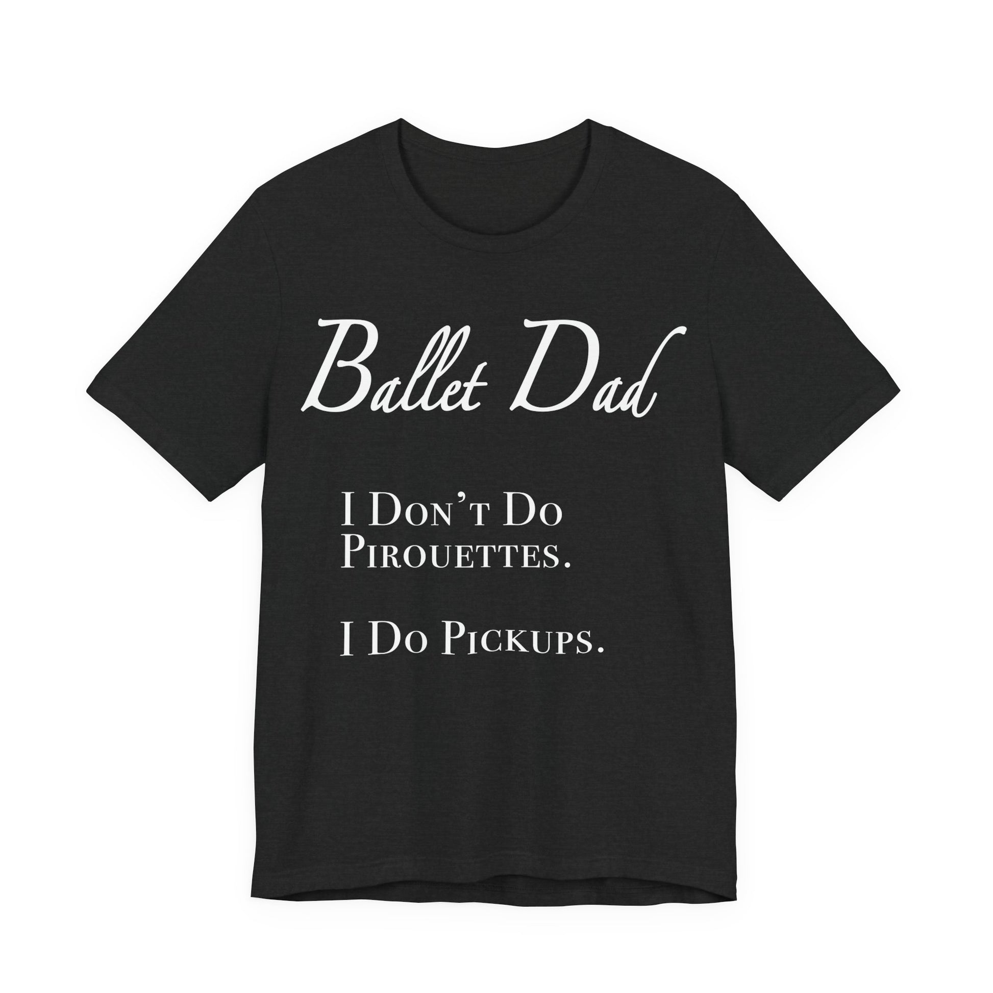 Soft, breathable tee made from 100% Airlume combed and ring-spun cotton that wears like a favorite right away. The clean crew neckline, side seams and shoulder tape keep the shape through rehearsals, recitals and long days at the studio. Front lettering reads a proud, tongue-in-cheek message for dads who trade pirouettes for pickup duty — low-key, confident and unmistakably supportive. Lightweight and easy to layer, it slips on after practice or pairs with jeans for errands, carrying the quiet pride of a parent who’s always there for curtain call.